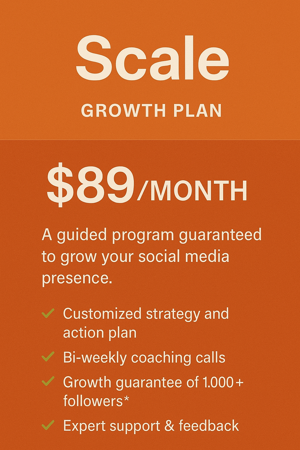 Ready to take your growth seriously? The Scale Plan is built for creators and businesses who want guaranteed results and expert support. If you’re ready to grow consistently, this is for you.